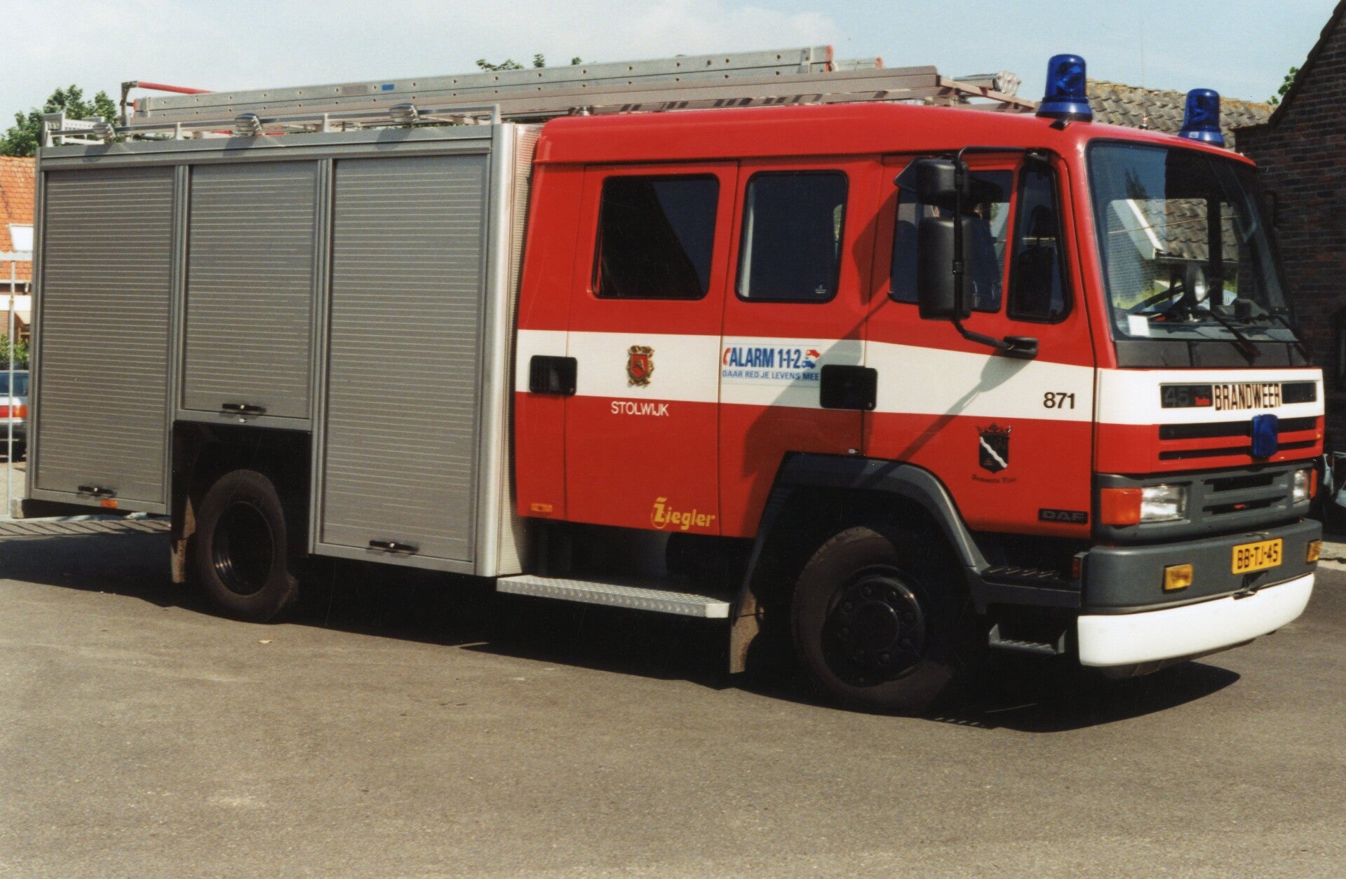 Kenteken: BB-TJ-45 Roepnummer: 62-871 > 16-3285 Type voertuig: HV-2 / PM7 Merk & Type: DAF FF45.150-09CE325 Opbouw: Ziegler Brandweertechniek Bouwjaar: 1995 In dienst: 1995 Uit dienst: 2014